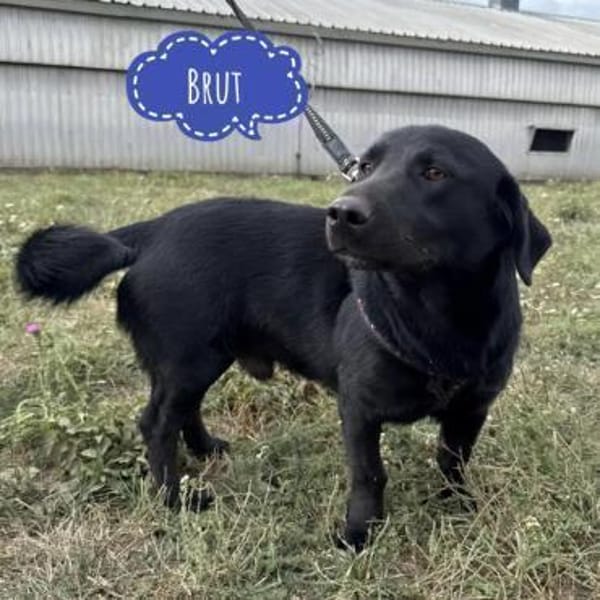 Brut ist ein Rüde, laut Tierarztschätzung ca. 2,5 Jahre alt (geb. 13.03.2023), 40 cm groß und wiegt 18,4 kg. Vermutet wird ein Mischling aus Labrador und Dackel.