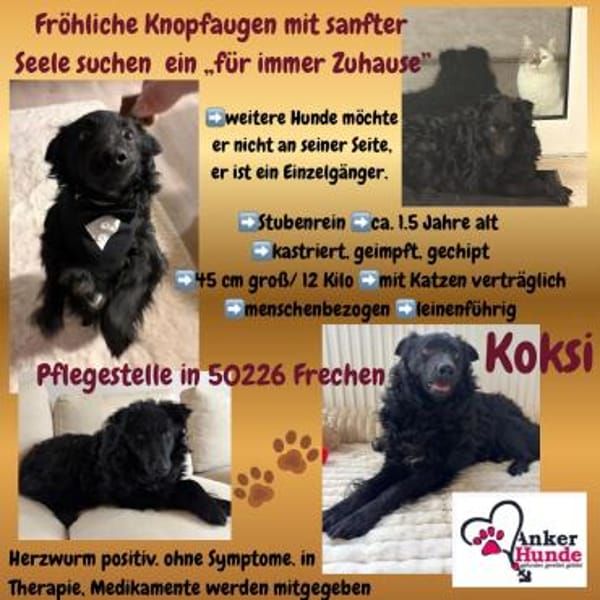 Mit seinem treuen Blick ĂŒberzeugt er alle in seinem Umkreis. Er zeigt sich sehr ruhig, verschmust und sucht gern die NĂ€he zu Menschen. Koksi ist ca. 13 Kilo schwer und 45 cm groĂ .