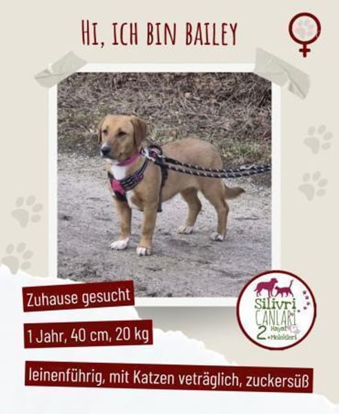 Bailey ist eine etwa ein Jahr alte Dackel-Mischlingshündin mit ca. 45 cm Schulterhöhe und rund 20 kg Gewicht. Sie zeigt sich momentan noch schüchtern und muss vieles in der Welt erst kennenlernen. Mit etwas Geduld fasst sie Vertrauen und zeigt sich dann sehr zutraulich und verschmust.