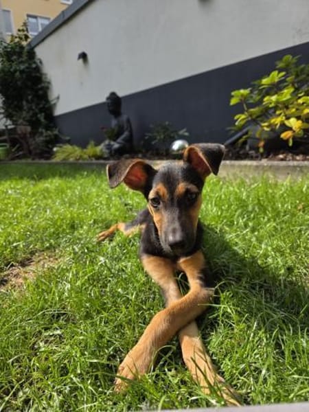 Sie ist lernfreudig und kennt bereits einige Grundkommandos: Warte klappt gut, Platz kann sie schon, und Bei Fuß wird aktuell geübt.