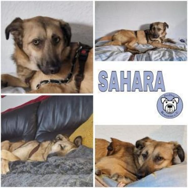 Sahara wurde in ihrem Zwinger in Rumänien sehr von den anderen Hunden gemobbt und versteckte sich in ihrer Hütte. Den Volontären vor Ort wich sie auch lieber aus, als sich anfassen zu lassen, ließ es jedoch über sich ergehen.