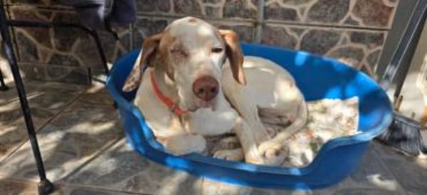 Jara wurde von Tierschützern bei einem Jäger sichergestellt. Dort wurde das kleine Pointer-Mädchen als Gebärmaschine misshandelt. Durch die vielen Welpen die Jara zur Welt brachte und säugen musste, sind ihre Zitzen seither deformiert.