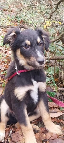 Tobi, geboren im Juli 2025, ist ein kleiner Mischlingsjunge, der mittelgroß werden wird.