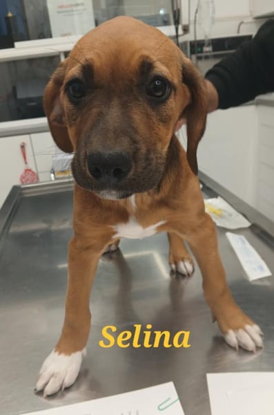 Selina- in wunderschönem braun-weiß mit weißen Söckchen, wünscht sich ein liebevolles furever-Zuhause, sobald sie reisen darf. Den ersten Gesundheitscheck haben alle acht schon mit Bravour bestanden.