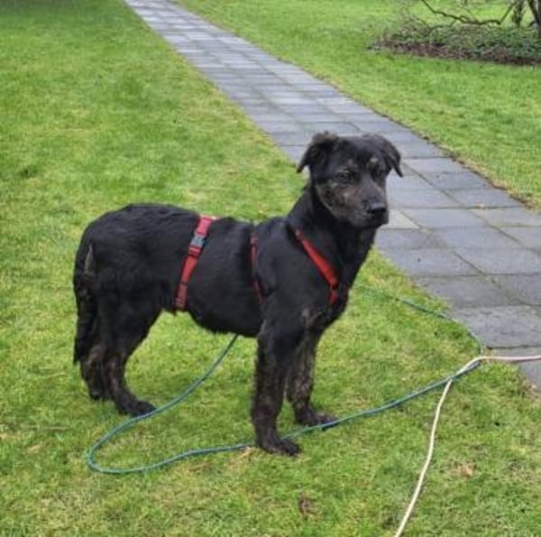vermutlich ein Labrador-Mix mit wunderschönem schwarz gestromtem Fell und großen Pfoten.