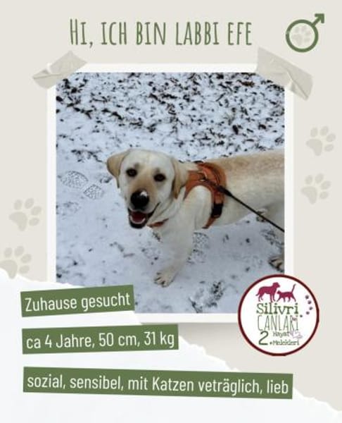 Efe ist ein kastrierter Labrador-Rüde im Alter von etwa 4 Jahre und wiegt rund 31 kg. Er stammt aus Silivri in der Türkei und ist ein sehr feinfühliger Hund, der sensibel auf seine Umgebung reagiert.