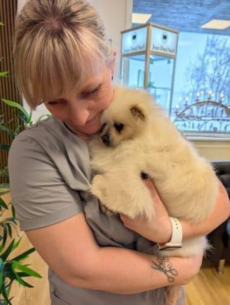 Auf den Fotos, auf denen sie gemeinsam mit Iris zu sehen ist, ist Mini die kleinere Hündin links im Bild. Auch beim Hundefriseur hat sie sich von ihrer besten Seite gezeigt und war dabei ganz brav.