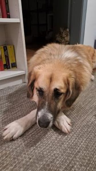 Die griechische Hirtenhündin ist etwa 3,5 Jahre alt, über 70cm groß und ca 45 kg schwer.