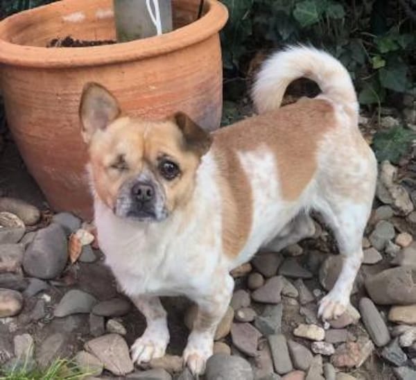Sein rechtes Auge musste aufgrund einer Blindheit entfernt werden, doch Bruno hat diesen Eingriff sehr gut überstanden. Er kommt damit hervorragend zurecht: Er bewegt sich sicher, läuft wie ein ganz normaler Hund, ist neugierig, flott und lebensfroh.