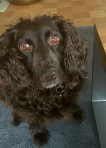 Moka, weiblich, kastriert, ca. 43cm, ca. 23 kg (noch zu dick), Deutscher Wachtelhund (Mischling?), geboren am 04.06.2019, ist eine noch übergewichtige und ruhige Hundedame. Moka ist stubenrein und fährt auch gerne im Auto mit. Mit ihrer Hundefreundin kann sie auch eine Zeit lang alleine bleiben. Moka ist leider, wie sich herausstellte, Leishmaniose positiv.