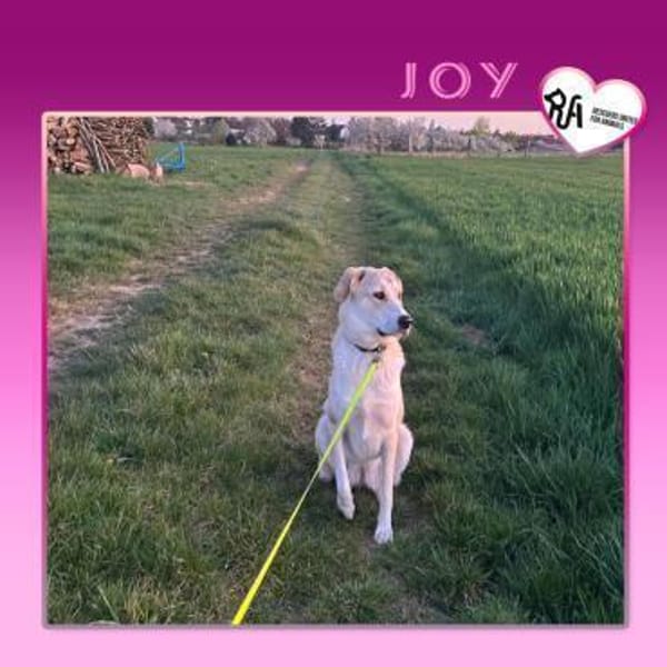 Joy befindet sie sich in der Pubertät und testet ihre Grenzen aus. Sie braucht Menschen, die sie konsequent erziehen und führen. Das Autofahren ist sie gewöhnt, sie läuft gut an der Leine und bleibt auch 3-4h ohne Probleme allein.