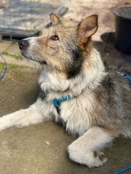 Andy 2023 aus Spanien nach Deutschland. Ursprünglich wurde er auf dem Mittelstreifen einer Autobahn kauernd aufgelesen und in unser privates Tierheim gebracht.