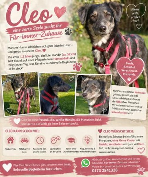 Die etwa 1,2 Jahre junge, zierliche Hündin (ca. 52 cm) lebt aktuell auf einer Pflegestelle in Kleve und zeigt dort jeden Tag, was für eine wundervolle Begleiterin in ihr steckt. Cleo ist eine sensible, sanfte und unglaublich liebe Seele. Sie beobachtet ihre Menschen zunächst vorsichtig, doch wenn sie merkt, dass sie vertrauen kann, öffnet sie ihr Herz und zeigt ihre verschmuste, anhängliche Seite.