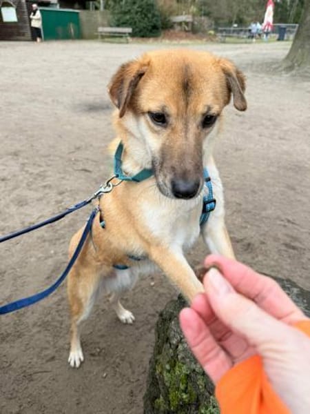 Rocky hat im Tierheim etwas Kummerspeck angesetzt, den er aber nun ganz von alleine zu verlieren scheint. Er ist in keinster Weise verfressen oder darauf aus sich irgendwie selbst zu bedienen und mit ausreichend Bewegung und angepassten Portionen purzeln die Pfunde nun rasant.