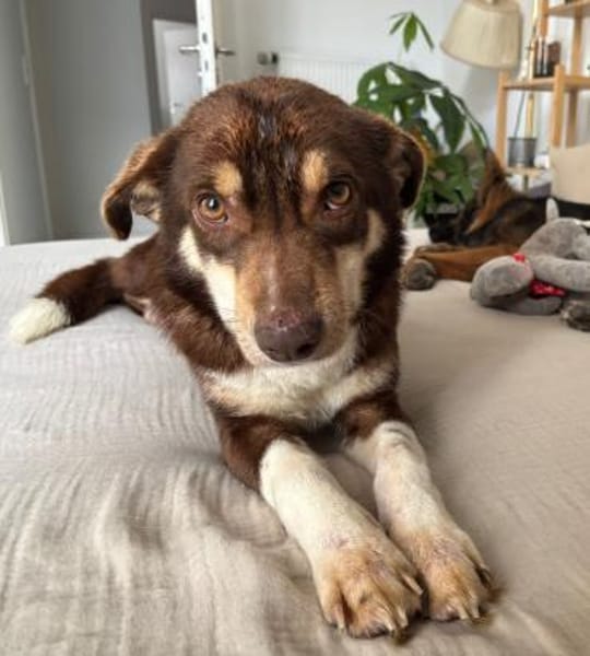 Emil, Mischlingsjunge, geboren am 03.10.2024, hat eine Schulterhöhe von ca. 46 cm und wiegt ca. 14 kg.