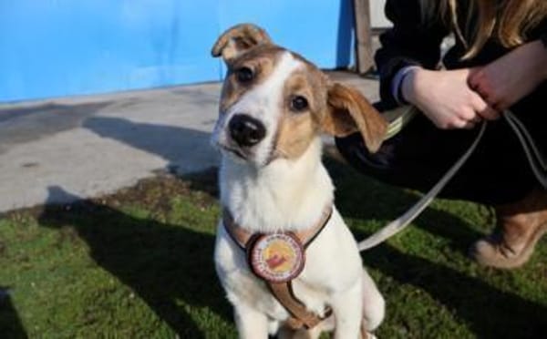 Kinderliebes Jackie-Mix-Mädchen Anda möchte die Welt entdecken. Beim ersten Anblick erinnert Anda vor allem durch ihr Köpfchen und ihr aufgewecktes und lebendiges Wesen stark an einen Jack-Russel-Mix. Ihr weiches Fell ist überwiegend weiß mit hellbraunen und dunkelbraunen Flecken. Sie wird auch ausgewachsen eine angenehme Größe behalten.