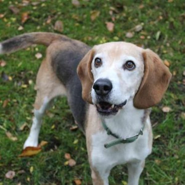 Typisch Beagle! Er liebt Spaziergänge, die Natur und natürlich das Stöbern. Trotz seines Alters ist er noch richtig aktiv und ja, verfressen sehr verfressen.