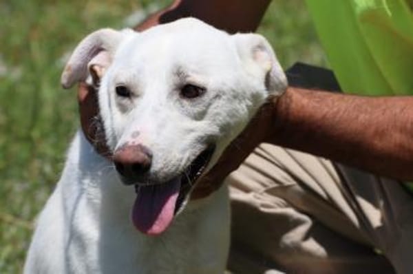 Der menschenbezogene, weiße Rüde ist geimpft, entwurmt, gechippt und kastriert.