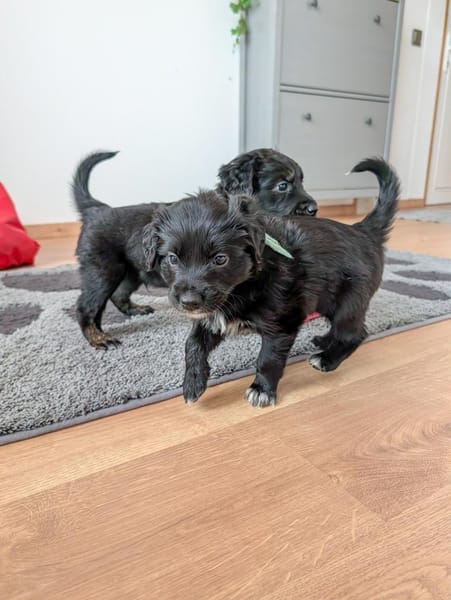 Die Welpen sind RetrieverBorder Collie Mixe (und wer weiß, was noch alles mitgemischt hat 🐾) also kleine Überraschungspakete mit viel Potenzial, Energie und Herz.