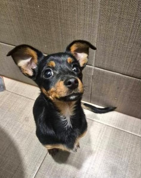 Persy ist eine ca.10/2025 geborener Pinscher-(Zwergpinscher-Mix?)-Hündin mit einer derzeitigen Schulterhöhe von ca. 23 cm.