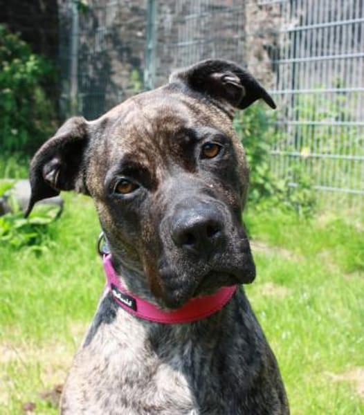 Als Staffordshire-Mix gilt Cora in NRW als Listenhund, weshalb an ihre Haltung einige Auflagen geknüpft sind.