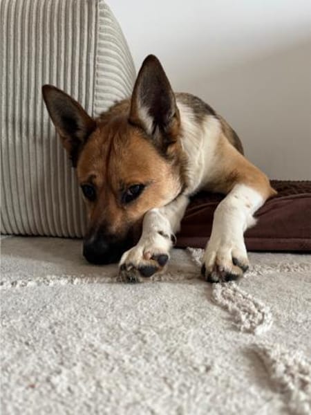 In der Wohnung ist er ruhig und entspannt. Er liegt gern gemütlich in seinem Körbchen, aber wenn keiner hinschaut, schleicht er sich gerne mal auf Sofa. Der junge Rüde liebt es gestreichelt zu werden und kugelt sich dafür gerne ganz charmant auf den Rücken. Er zeigt keinerlei Berührungsängste und lässt sich ohne Probleme duschen, die Krallen schneiden oder Zähne, Ohren und Augen anschauen. Er ist zu 100% stubenrein und schläft nachts in seinem Körbchen durch. Auch am Wochenende mal länger liegen zu bleiben stört den hübschen Dugó überhaupt nicht. Fürs Home-Office ist er definitiv geeignet. Wir können uns Dugó auch gut als liebenswerten und ruhigen Bürohund vorstellen.