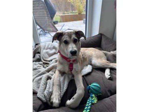 Ein großer Welpe mit großem Herzen. Khalil ist total verschmust und menschenbezogen, verspielt, fröhlich und neugierig. Ein kleiner Tollpatsch, der manchmal noch über seine eignen Pfoten stolpert. Ein bisschen ähnlichkeit mit Scooby Doo hat.