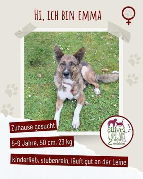 Für Emma wünschen wir uns ein ruhiges, liebevolles Zuhause mit Menschen, die ihr Sicherheit geben und sie in ihrem Tempo ankommen lassen. Wer ihr diese Zeit schenkt, bekommt eine treue, sanfte und wunderbare Begleiterin fürs Leben.