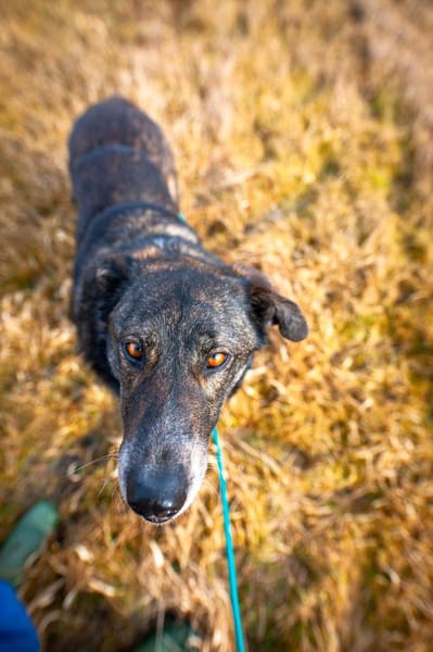 Im Außenbereich ist Rudy aufmerksam und neugierig gegenüber seiner Umwelt. In der ruhigen, ländlichen Umgebung, in der er derzeit lebt, läuft er entspannt an der Leine. Autos, LKWs und Fahrräder nimmt er gelassen wahr und orientiert sich zuverlässig am Menschen. Auch städtischen Umgebungen begegnet er interessiert und lässt sich gut führen. Mit jedem Ausflug wird er sicherer, gewinnt an Gelassenheit und lernt zunehmend, Relevantes von Unwichtigem zu unterscheiden.