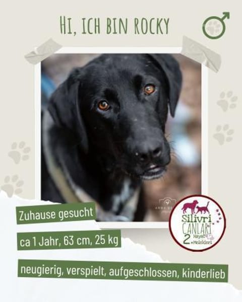 Dieser etwa einjährige schwarze Labrador-Rüde namens Rocky überzeugt mit seinem freundlichen Wesen und seiner offenen Art. Mit einer Schulterhöhe von ca. 63 cm und einem Gewicht von rund 25 kg bringt er eine sportliche, schlanke Statur mit.