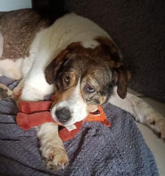 Frida konnten wir mit Hilfe einer tierlieben Patin wenige Tage vor Weihnachten '25 aus einer Tötungsstation befreien und vorübergehend in einer Hundepension in Linares/Spanien unterbringen. Mitte April '26 durfte sie zu einer Pflegefamilie nach Deutschland ziehen.