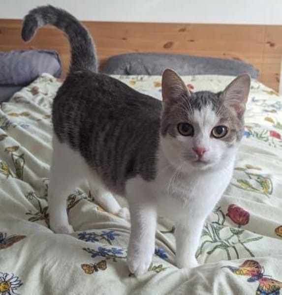 Luis ist ein kräftiger Kater, aktiv, kletterfreudig, braucht viel Bewegungsraum. Sein Fell ist weiß mit graumeliertem Tigerdeckhaar. Er setzt beim Spiel gerne mal die Krallen ein, sollte daher zu einem passenden Katzenpendant und Menschen mit Nachsicht kommen.