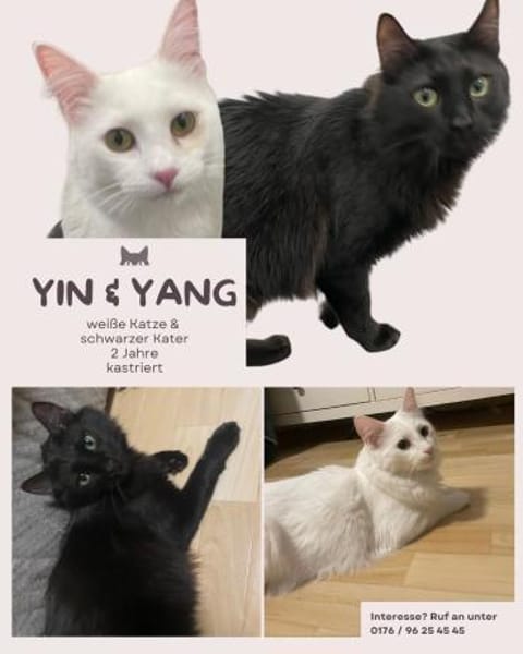 Yin, die weiße Katze, und Yang, der schwarze Kater, werden im kommenden Frühjahr 2 Jahre alt.