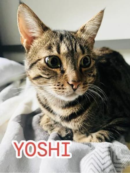 Er kam schon als Kitten zusammen mit seiner Schwester zu einer jungen Frau. Leider entwickelte sich sein weiteres Leben nicht optimal, die Schwester mobbte ihn. Sie wurde dann abgegeben und Yoshi war plötzlich allein.