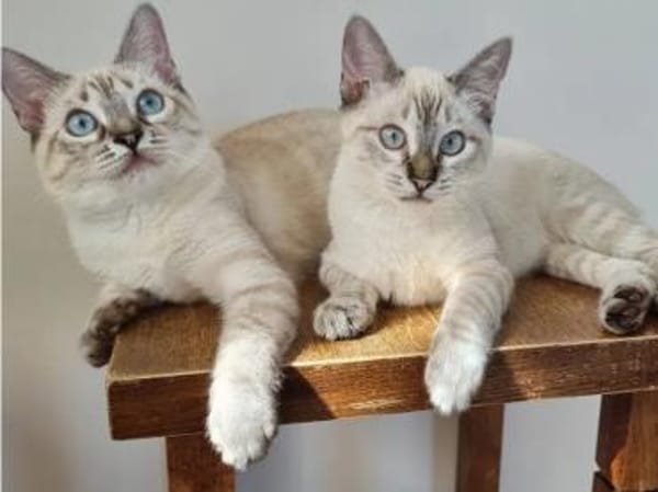 Die beiden Siamgeschwister Mira und Marlene wurden in einem Karton neben einem Müllcontainer gefunden. Sie waren vielleicht 3 Wochen alt. Marietta , die die Kleinen fand, nahm sie mit nach Hause und sie wurden von ihr liebevoll mit der Flasche aufgezogen. Inzwischen fressen sie selbständig und entwickeln sich prächtig.