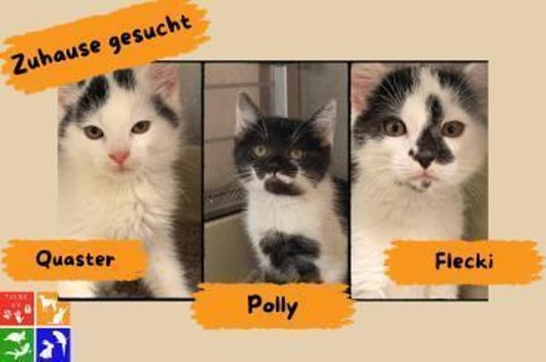 Quaster, Polly und Flecki sind drei aufgeweckte, verschmuste Katzenkinder, die neugierig durchs Leben tapsen und nur gemeinsam oder zu einem passenden Artgenossen vermittelt werden.