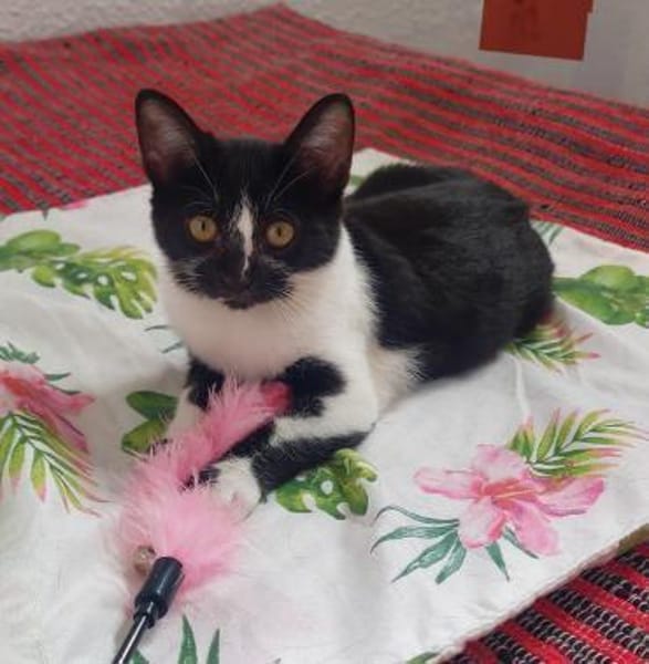 Penny mit dem lustigen weißen Streifen im Gesichtchen und dem weißen Kragen machte in der Nähe eines Wohltätigkeitsbasars in Spanien auf sich aufmerksam. Hier kauerte sie, noch keine drei Monate alt, alleine hinter einem Auto, maunzte mit dünnem, aber beharrlichem Stimmchen und ließ sich nach ein bisschen hin und her von unseren dortigen Tierschutzkollegen einfangen und in deren kleines, privates Tierheim bringen.