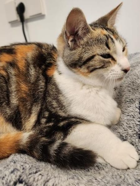 Schau mir in mein hübsches Gesicht! Das bin ich: Lulú geb. 9/25 eine dreifarbige, junge Katze.